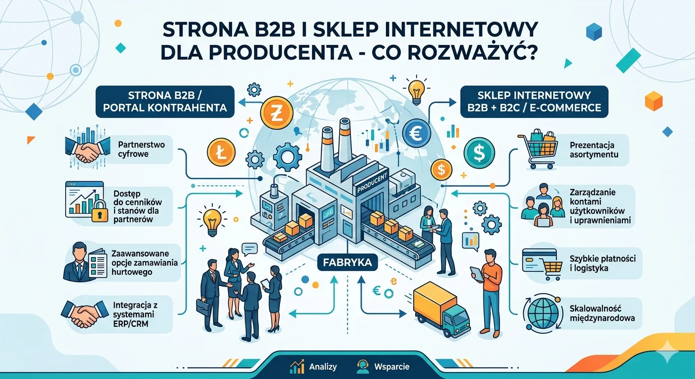 Producent lub średnia firma często potrzebuje nie tylko ładnej wizytówki, ale katalogu produktów (czasem bez cen publicznie), formularzy zapytań, pobrań kart technicznych PDF oraz jasnej ścieżki dla klientów hurtowych.